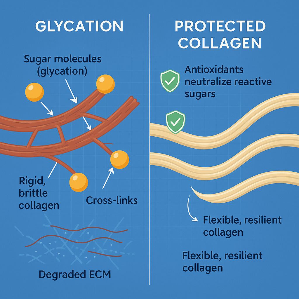 When sugar binds to collagen, it forms Advanced Glycation End Products (AGEs) that make collagen rigid and weak. No surface moisturizer can reverse that internal damage.